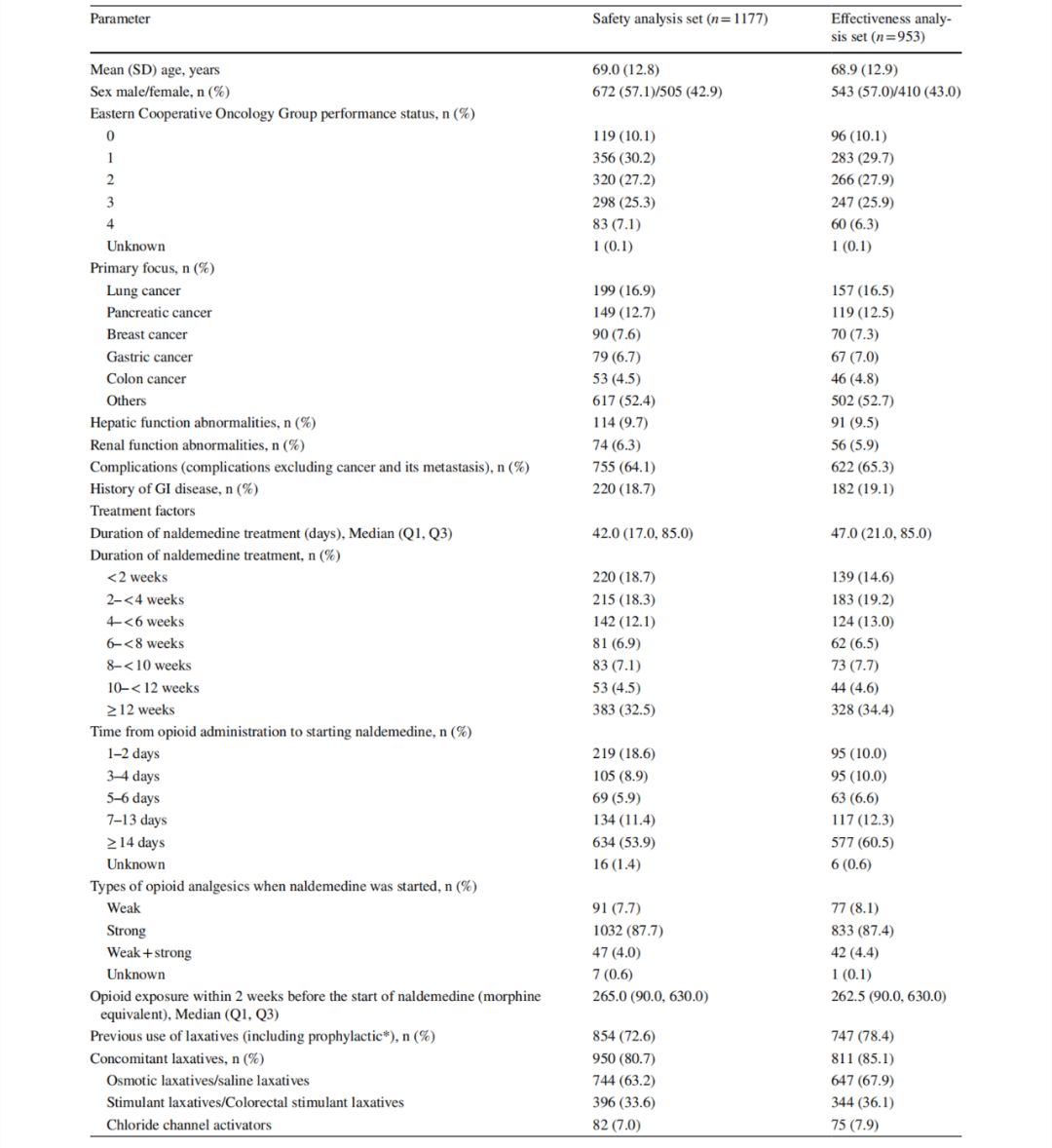 参考资料:Takata, K., Nakazawa, M., Honda, K. et al. Post-marketing surveillance of the safety and effectiveness of naldemedine in the management of opioid-induced constipation in patients with cancer pain in Japan.Support Care Cancer 30, 3943–3954 (2022). https://doi.org/10.1007/s00520-022-06807-y