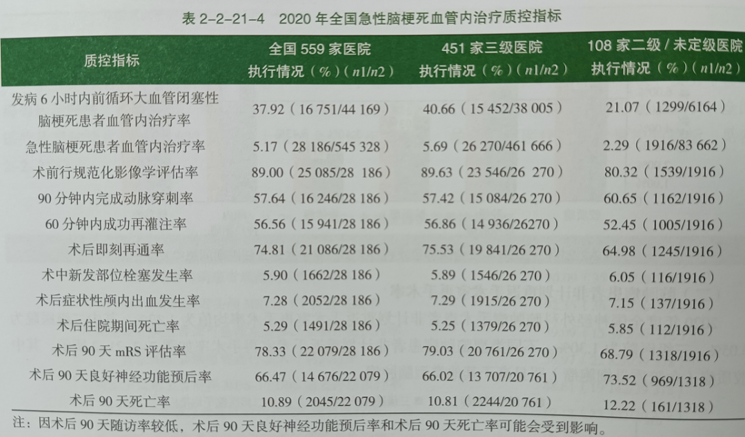 《报告》给出了559家医院的急性脑梗死血管内治疗质控指标执行情况,其中451家三级医院,108家二级或未定级医院。根据下图数据,发病6小时内前循环大血管闭塞性脑梗死患者血管内治疗率整体比例为37.92%,其中三级医院40.66%、二级医院21.07%,差距较大;而“急性脑梗死患者血管内治疗率”整体为5.17%,“60分钟内成功再灌注率”为56.56%。