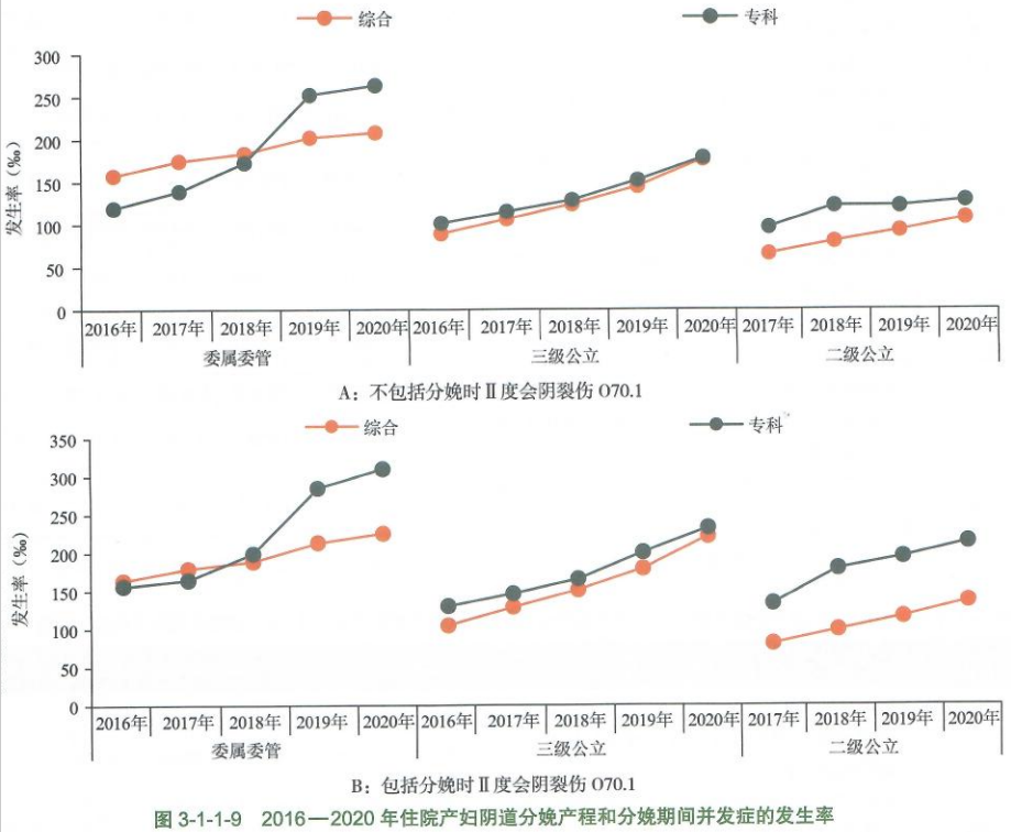 《报告》显示,2020年二级、三级公立医院出院患者中按阴道分娩总人次计算,阴道分娩产程和分娩期间并发症的发生率呈逐渐上升趋势。其中,不包括分娩时Ⅱ度会阴裂伤070.1的发生率,三级综合医院、三级专科医院分别较2016年上升了87.53个千分点和76.99个千分点,二级综合医院、二级专科医院分别较2017年上升了41.69个千分点和31.33个千分点。见下图。