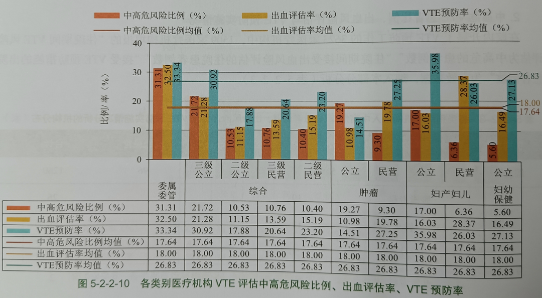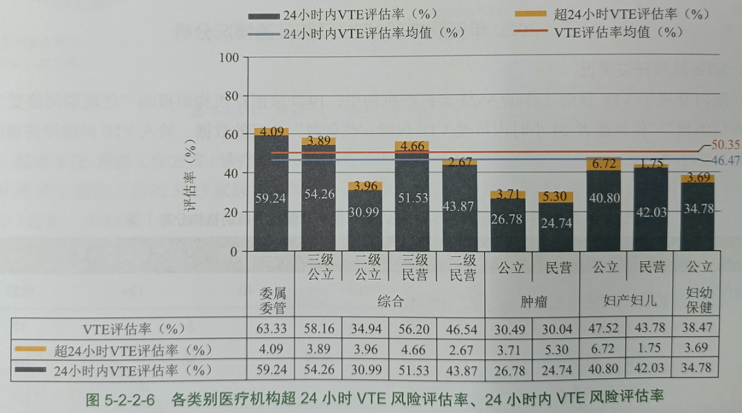 《报告》显示,纳入分析的医疗机构中,VTE风险评估率均值为50.39%,24小时内VTE风险评估率均值为46.47%。综合医院中,三级医院的这两个指标高于二级医院。专科医疗机构中,妇产、妇儿专科VTE风险评估率相对较高。见下图。