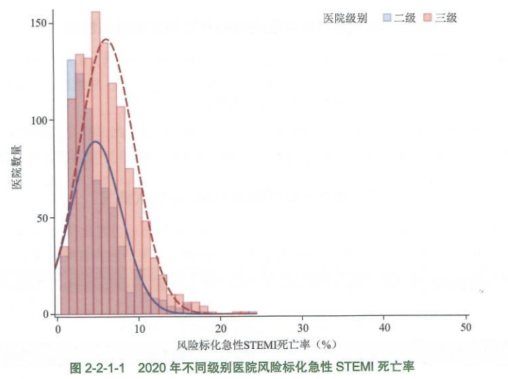 基于HQMS数据,2020年急性STEMI住院患者院内死亡率为5.0%,通过患者年龄、性别等人口学特征,以及并发症等临床特征,建立医院水平风险标化的院内死亡率,发现三级医院略高于二级医院,且医院间异质性更明显(见下图)。