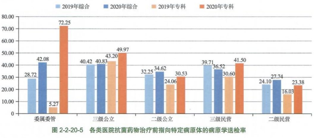 《报告》指出,2020年共有4142家医院纳入抗菌药物治疗前指向特定病原体的病原学送检率的数据统计分析,发现三级公立、二级公立、三级民营、二级民营医院分别为40.83%、34.62%、36.52%、27.74%。