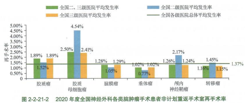 数据截自:《2021年国家医疗服务与质量安全报告》“非计划重返手术室再手术率”在重点专业的分析中有体现,如神经系统疾病专业中,2020年度全国神经外科各类脑肿瘤手术患者非计划重返手术室再手术率均值为1.37%,其中二级医院为3.05%,三级医院为1.30%。不同类型脑肿瘤患者的该指标数据如下图所示,其中胶质瘤(含胶质母细胞瘤)明显高于其他类型脑肿瘤。 数据截自:《2021年国家医疗服务与质量安全报告》