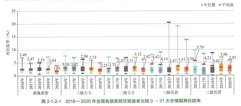 在《报告》的“重返类指标分析”章节中,未对“非计划重返手术室再手术率”进行分析,主要分析住院患者出院非预期再住院率。其中,2020年委属委管医院、三级公立医院、二级公立医院、三级民营医院、二级民营医院的住院患者出院0~31天非预期再住院率均值分别为1.81%、2.23%、2.62%、2.58%、2.91%,低于2019年同期数据。见下图。