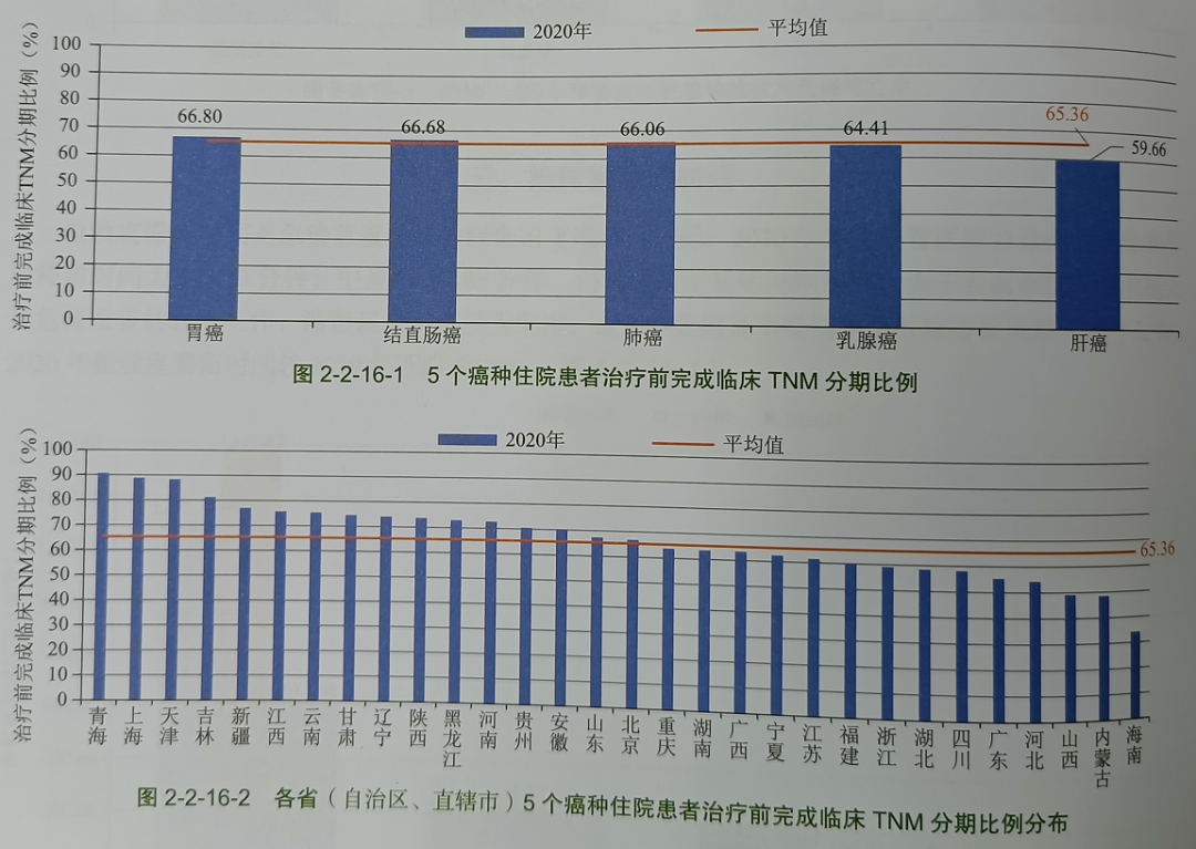 《报告》显示,2020年二、三级医院5个癌种住院患者治疗前完成临床TNM分期比例平均值为65.36%,其中,胃癌最高(66.80%),肝癌最低(59.66%);按省(自治区、直辖市)分布,青海最高(90.67%),海南最低(34.07%)。具体见下图。
