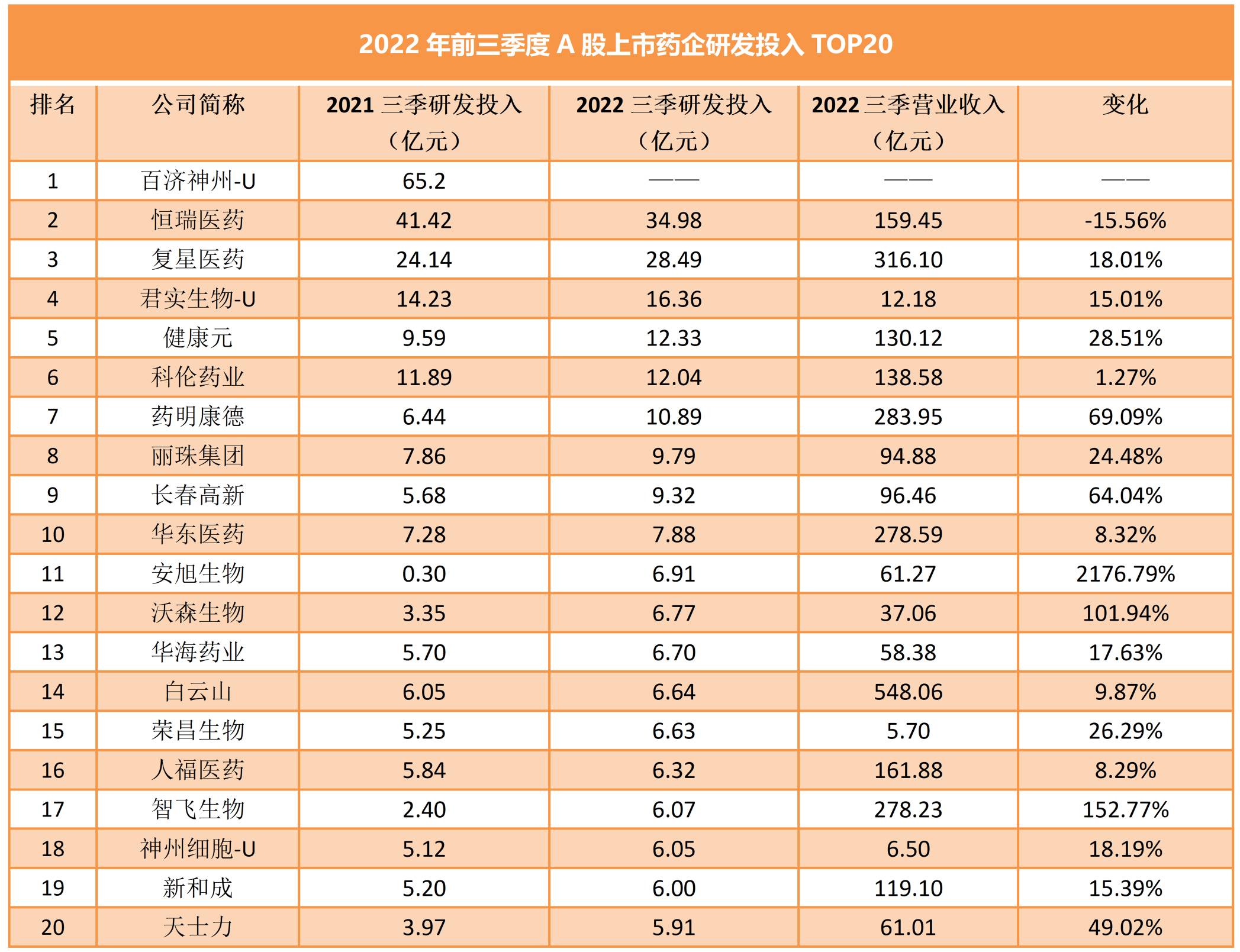 智慧药研根据药研圈、药融云、各公司三季财务报表披露等渠道整理国内A股上市药企研发投入TOP20排名,排名显示,作为在中国生物科技公司中全球临床布局和运营的领导者百济神州排名仍稳居第一,上半年研发投入50.16亿元,预计今年研发投入可达百亿元。值得注意的是,安旭生物2022年三季研发投入6.91亿元,同比增加6.61亿元,增幅高达22倍,这是一笔不菲的研发费用投入,高昂的研发费用也为其带来了近8倍暴涨式的营业收入。据了解,安旭生物其业绩大幅增长主要受全球新冠疫情持续发展的影响,公司研发新冠抗原检测、新冠抗体检测等系列高质量产品,获得客户认可,导致公司订单大幅增长,进而带动经营业绩大幅度增长。