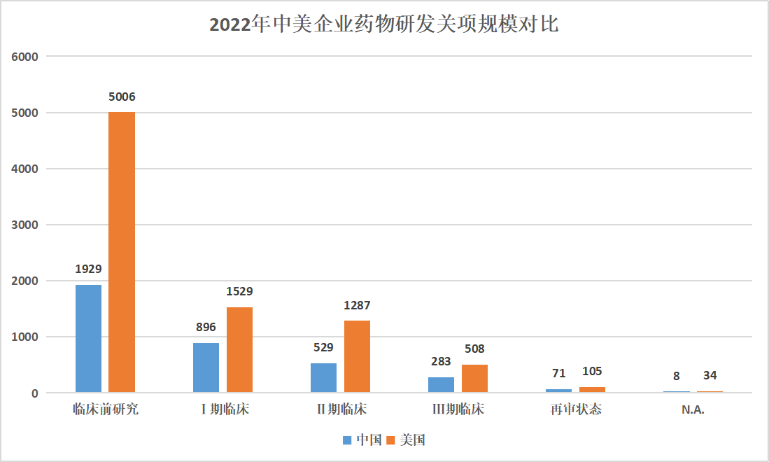 ▎研发规模据华经情报网、Pharmprojects数据库显示,截至2022年8月8日,研发企业总部位于中国大陆的、正处在活跃的研发过程的药物(包括lisence-in)3716个,将中国药物研发管线和美国药物研发管线进行对比,从管线规模上来看,中国与美国临床前研究的差距最大;但从管线结构上看,中国药物研发管线Ⅰ期临床、Ⅲ期临床药物占比较高,这说明中国药物研发在较早期的原始创新上投入较弱,更关注相对成熟的药物。
