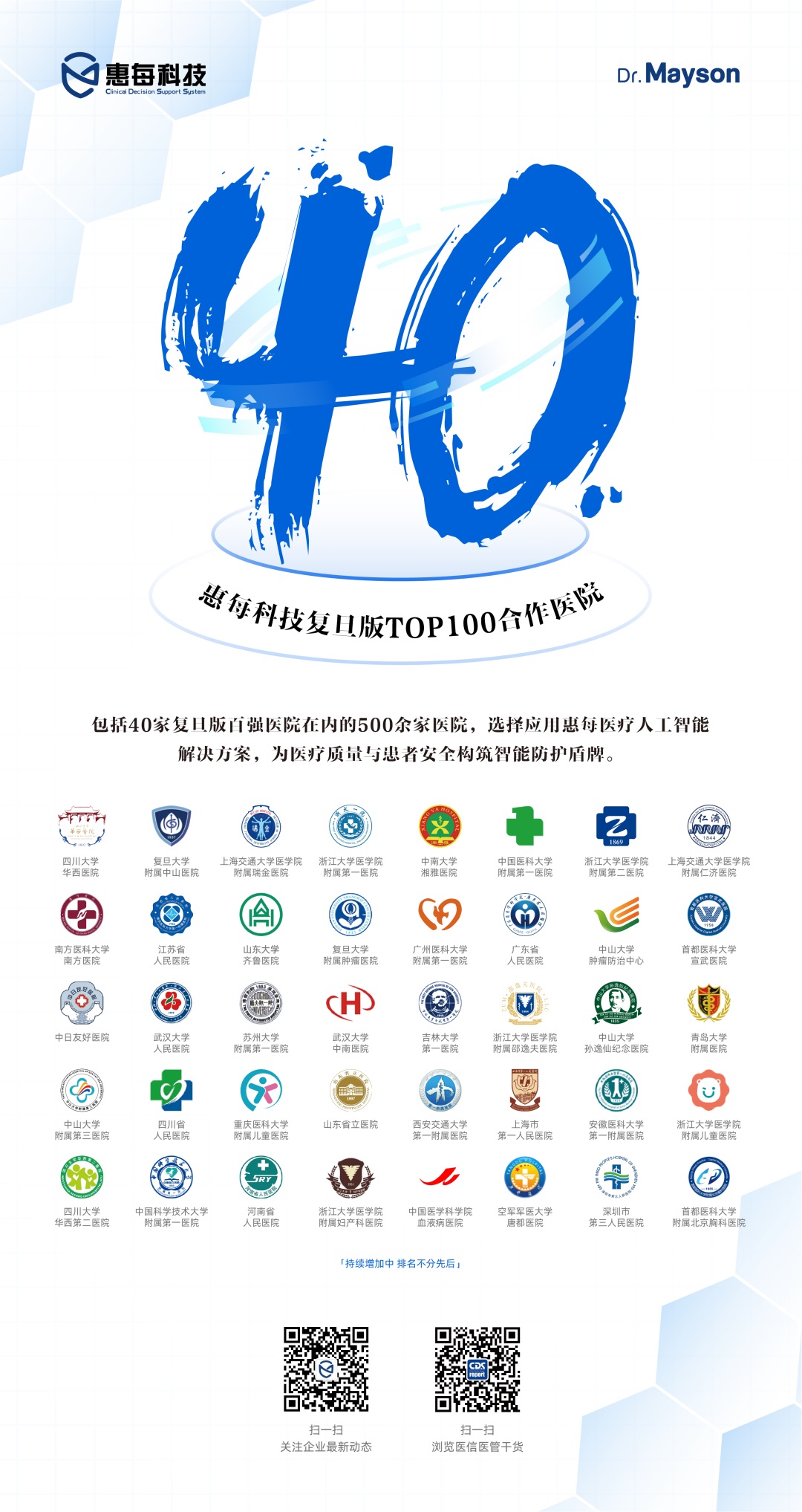 40家复旦版百强医院选择惠每医疗人工智能解决方案