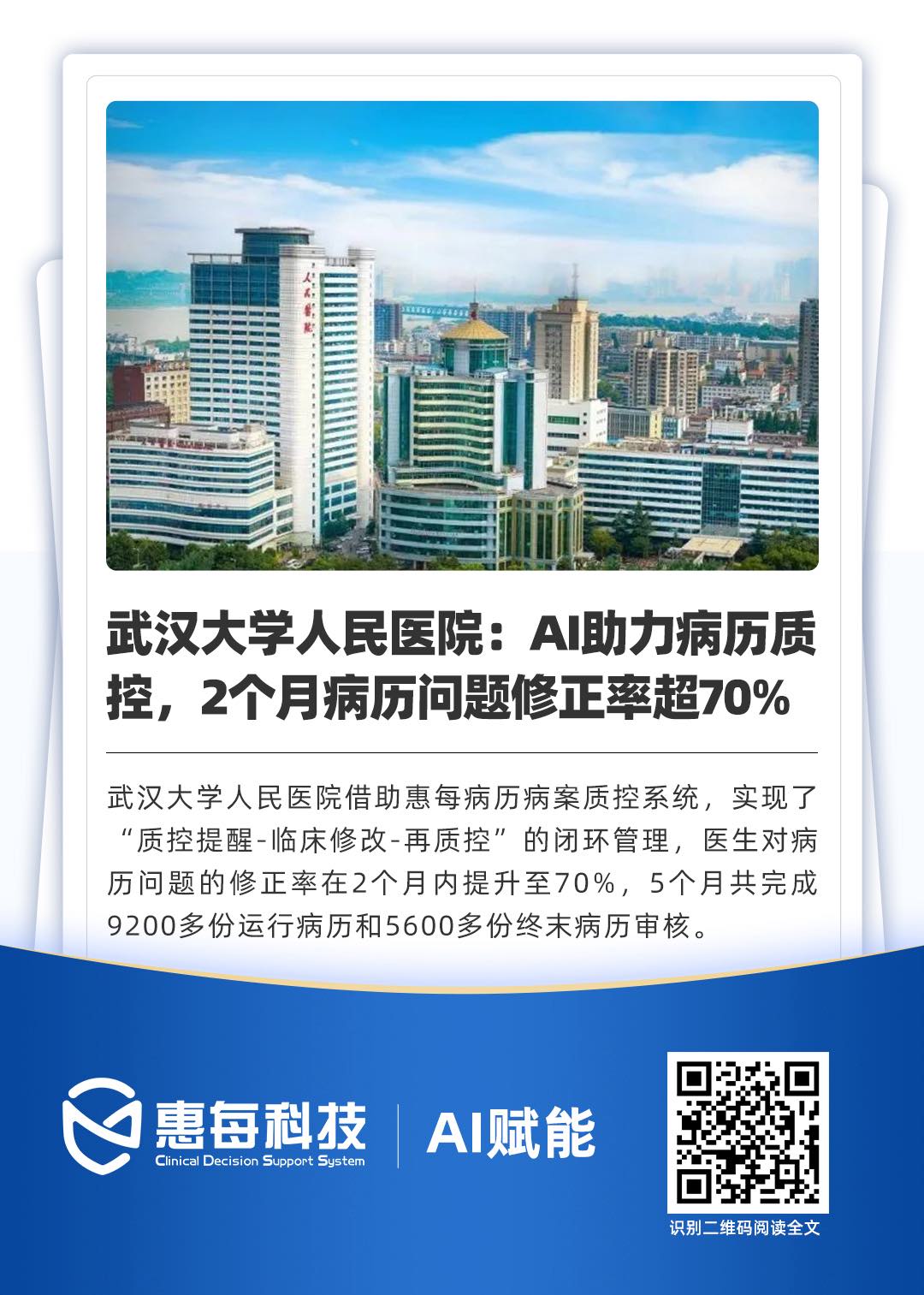 在人工智能技术的加持下,惠每CDSS凭借高质量、跨平台的数据治理能力和决策支持能力,为合作医院提供了客观数据和管理流程,持续助力临床高质量发展。多家医院基于惠每CDSS事中质控等功能,实现了病历内涵质控,打造出具有医院特色的质控闭环,助推互联互通等信息化建设。合作医院进行的一项最新研究,也验证了AI-CDSS可有效改善VTE防治效果。