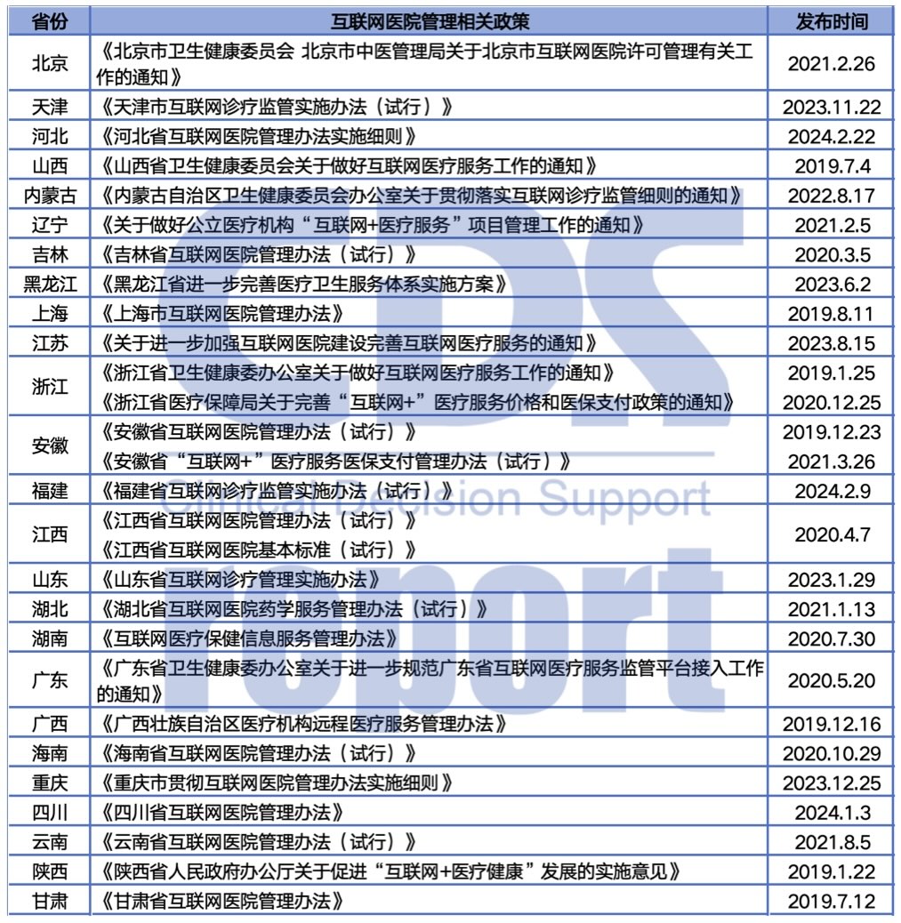 CDSreport整理各地互联网相关政策发现,各地正在逐步严格互联网医院批复标准,申请互联网医院设置必须依托实体医疗机构,且不得超过所依托的实体医疗机构诊疗科目范围,临床科室的设置也必须与实体医疗机构的临床科室保持一致等。这意味着,互联网医院的设立需要以所依托的实体医院为基础,将成熟的诊疗模式、质控体系和管理制度等延伸至线上,以保障互联网诊疗的质量和安全。