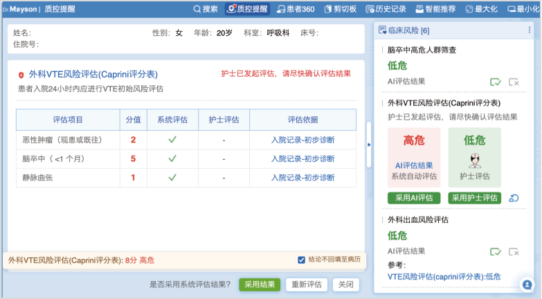 关键节点智能评估提示 | 筛查提醒 | 预防措施推荐 | 预防禁忌预警 | 指标数据统计分析
